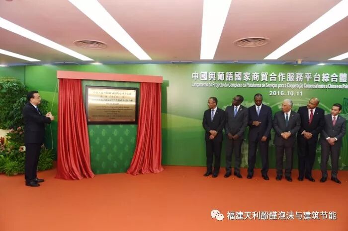 2016年10月11日,李总理在澳门出席中—葡语国家经贸合作论坛第五届部长级会议开幕式期间,为中葡商贸合作服务平台综合体揭牌。澳门特区行政长官崔世安和各葡语国家代表团团长参与启动仪式。