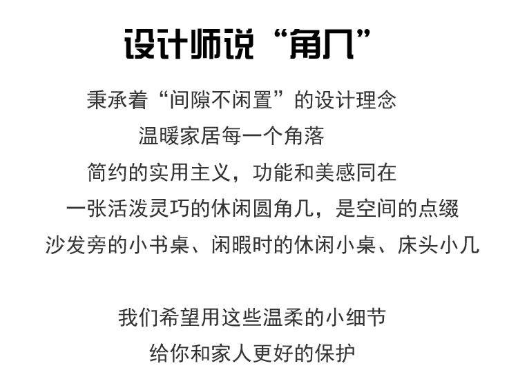这款具有北欧风情的实木茶几将简约发挥到**,同时在细节上十分精致,真材实料和加厚设计,大大提高了茶几面的承重性,茶几腿粗壮有力,扎实稳固,贴心脚垫不磨损桌脚,也不用担心刮擦地板。同时有三角几和大圆几供不同需求的主人选择。 |